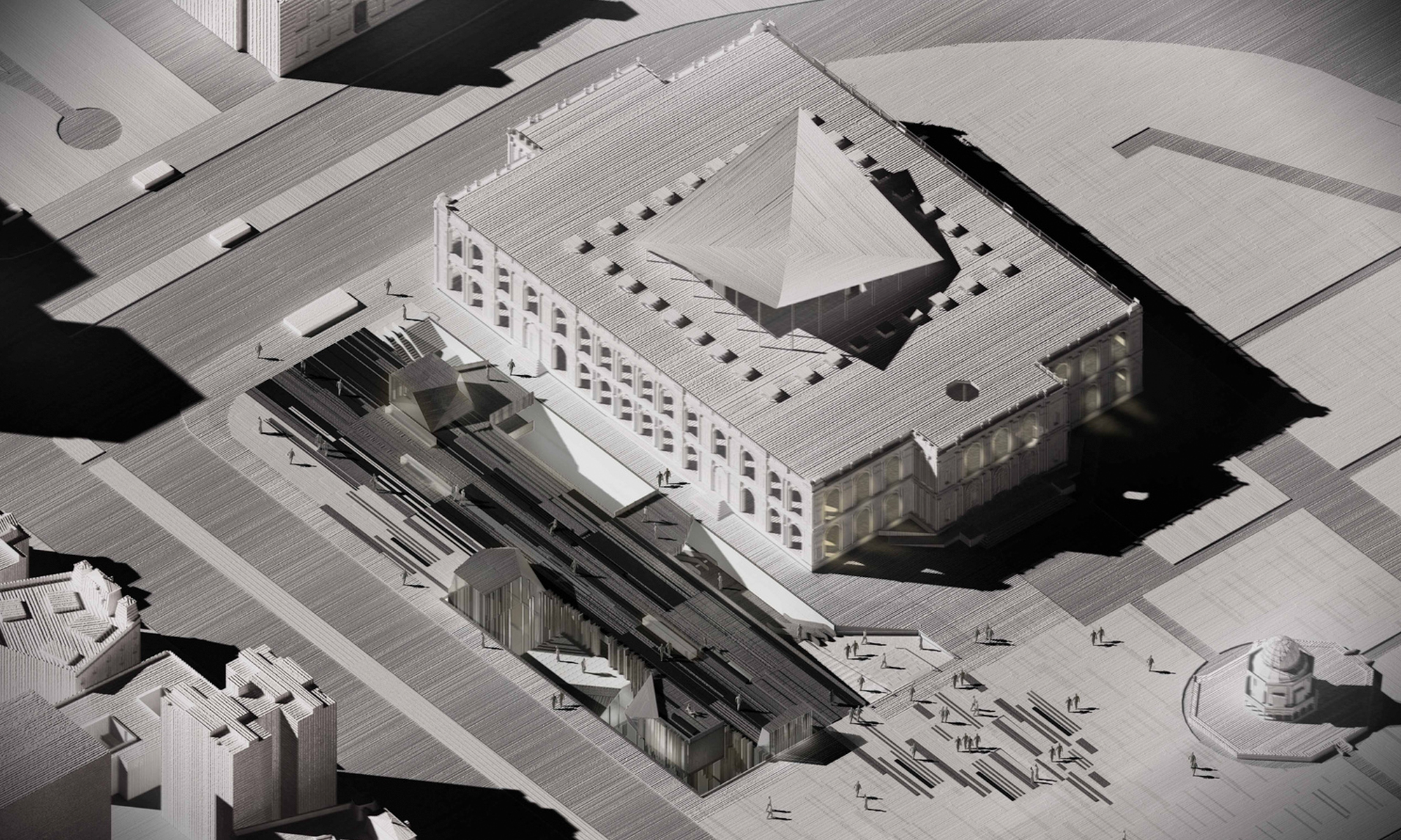 Serving as a kind of negative plinth, the project is predicated on resolving an urban condition and organizing the heavy pedestrian traffic of its busy intersection, rather than simply creating an object. The project combines the pragmatic efficiency of the linear bar shape with the crystalline character of its more idiosyncratic protrusions. In the balance between solid and void, object and field, building and excavation, it asserts itself as an engaged and mysterious grounded object—decidedly introspective and withdrawn while conspicuously iconic and texturally emblematic.